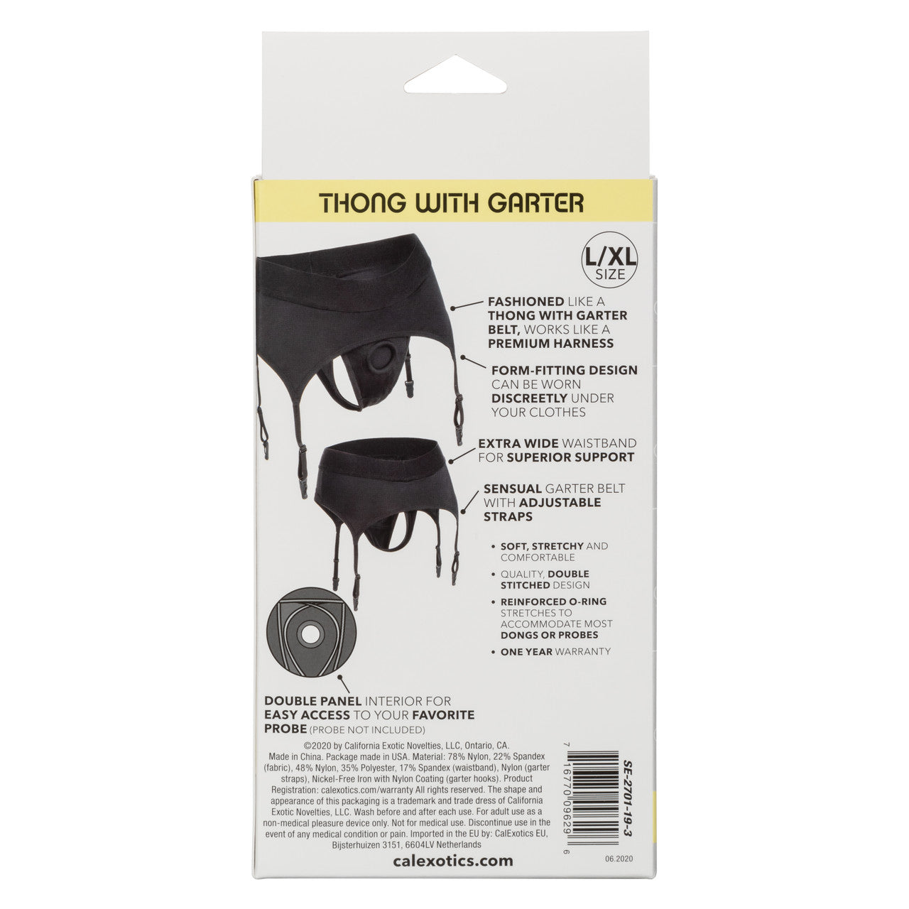 Adding a touch of sensuality, the harness includes a sensual garter belt with adjustable straps, perfect for those who appreciate a blend of style and eroticism. The double-panel interior is thoughtfully designed for easy access to your favorite probe (probe not included), ensuring your device is always within reach. A reinforced, stretchable O-ring is also included to accommodate a wide array of dongs or probes.