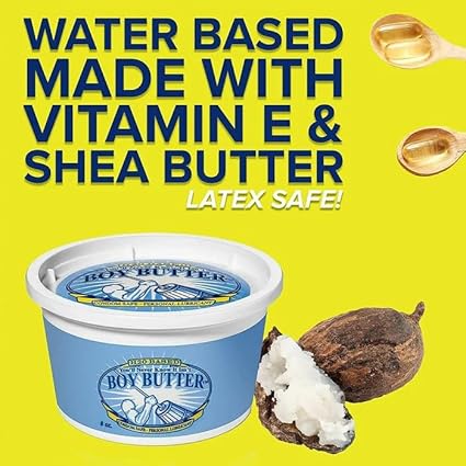 Boy Butter H20 is our water-based cream lubricant with added Vitamin E and Shea butter, whipped into an organic creamy faux-grease that safe to use equally for both men and women. The formula is creamy and goes on clear, the end result is a water based personal lubricant that feels like an oil-based lubricant yet is totally water-based, latex safe and vaginally safe.