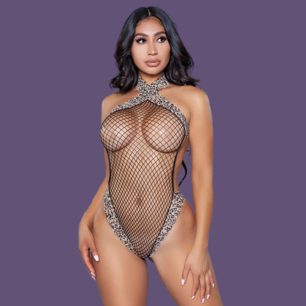Leopard print trim with fishnet mid detail bodysuit.