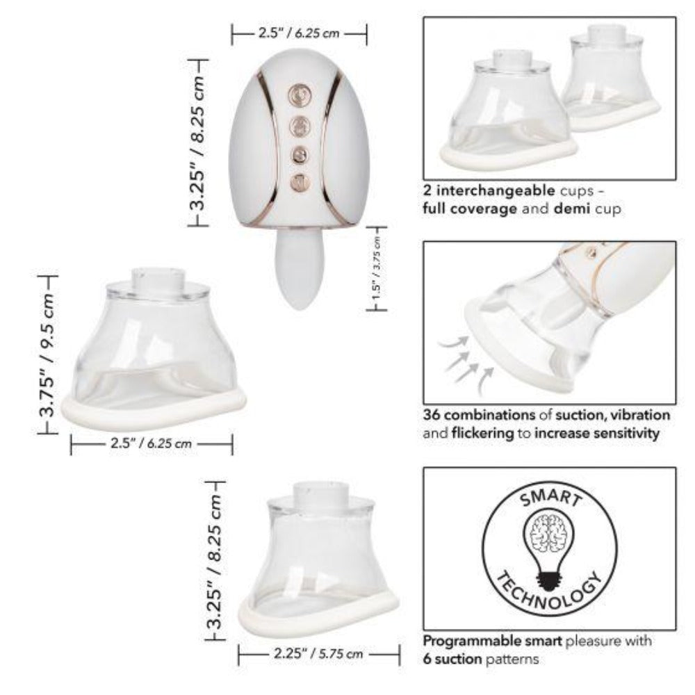 The Empowered Smart Pleasure Queen is a revolution in personalized satisfaction, blending flickering tongue vibrations, customizable suction, and pulsing patterns for a royal experience like no other. With 36 thrilling combinations to explore, you can set your favorite suction pressure, then layer in vibration and licking action exactly how you crave it. Two interchangeable cups—full coverage and demi—give you total variety, while smart memory programming keeps your go-to settings ready. Made from body-safe silicone with elegant white-and-gold styling, this discreet powerhouse comes with its own travel bag for privacy and convenience.