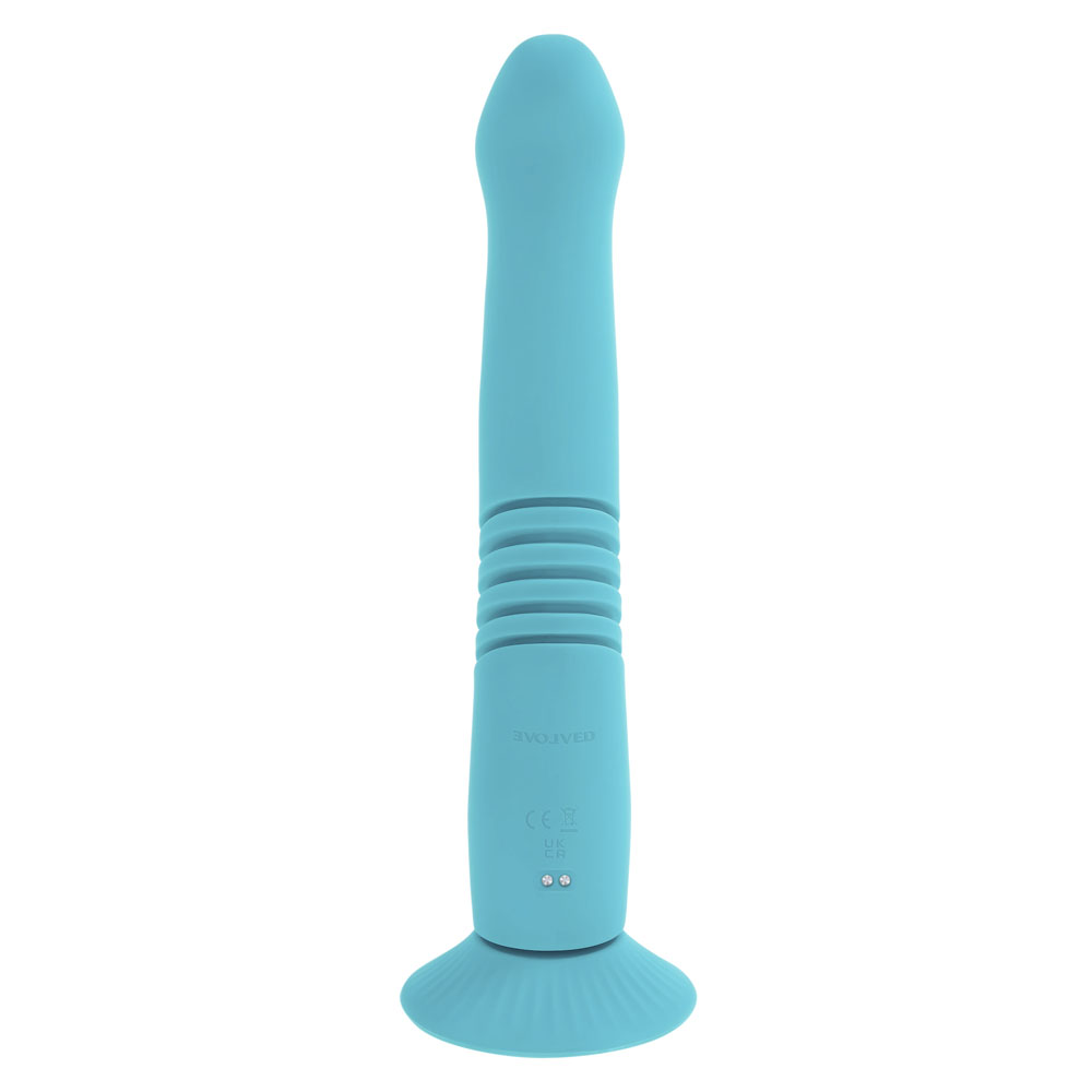 The Evolved Bunny Hop Thruster Rabbit Vibrator brings irresistible motion and strength together for an experience that’s pure indulgence. Designed with two dynamic motors, this teal beauty lets you enjoy nine thrusting modes and nine vibration patterns that pulse and drive in perfect unison or independently for tailored bliss. The flexible shaft delivers powerful, rhythmic thrusts while the bold bunny stimulator flutters against your clitoris, igniting waves of intensity. Attach the sturdy suction cup base for hands-free play or let the thruster move freely in your grip. Crafted from silky, body-safe silicone with gleaming stainless steel accents, this waterproof, rechargeable wonder takes pleasure to the next level — effortlessly powerful and endlessly thrilling.