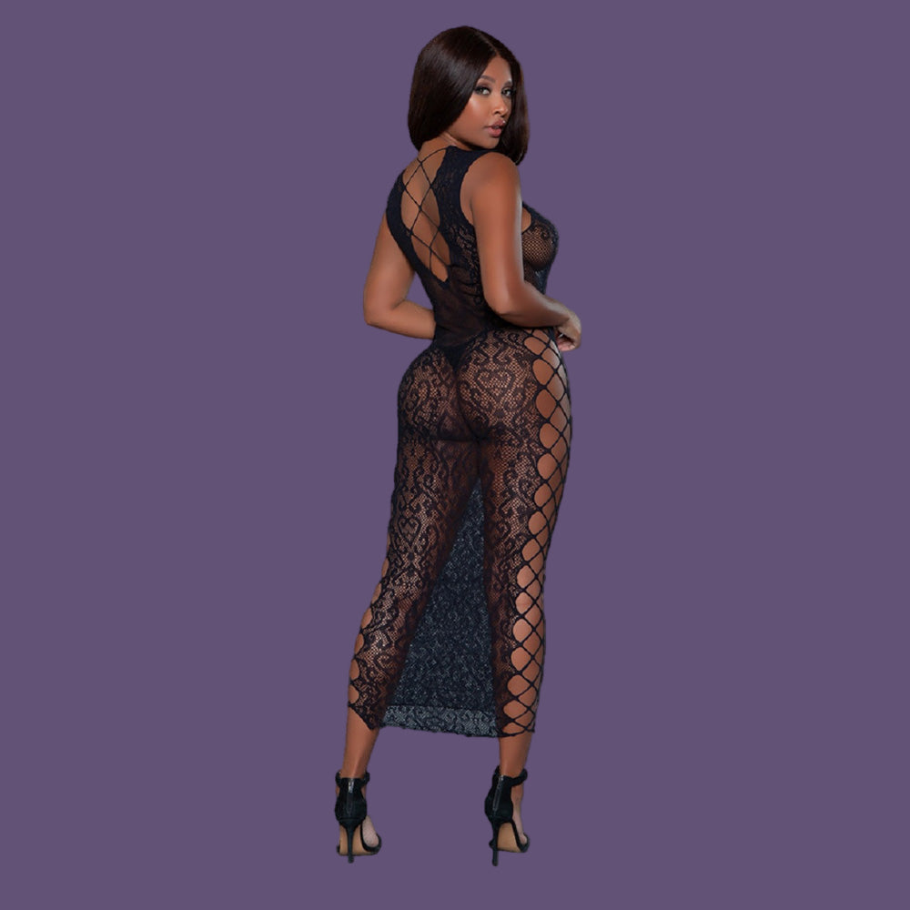 Sexy sleeveless sheer maxi dress with animal design and crisscross sides and back.