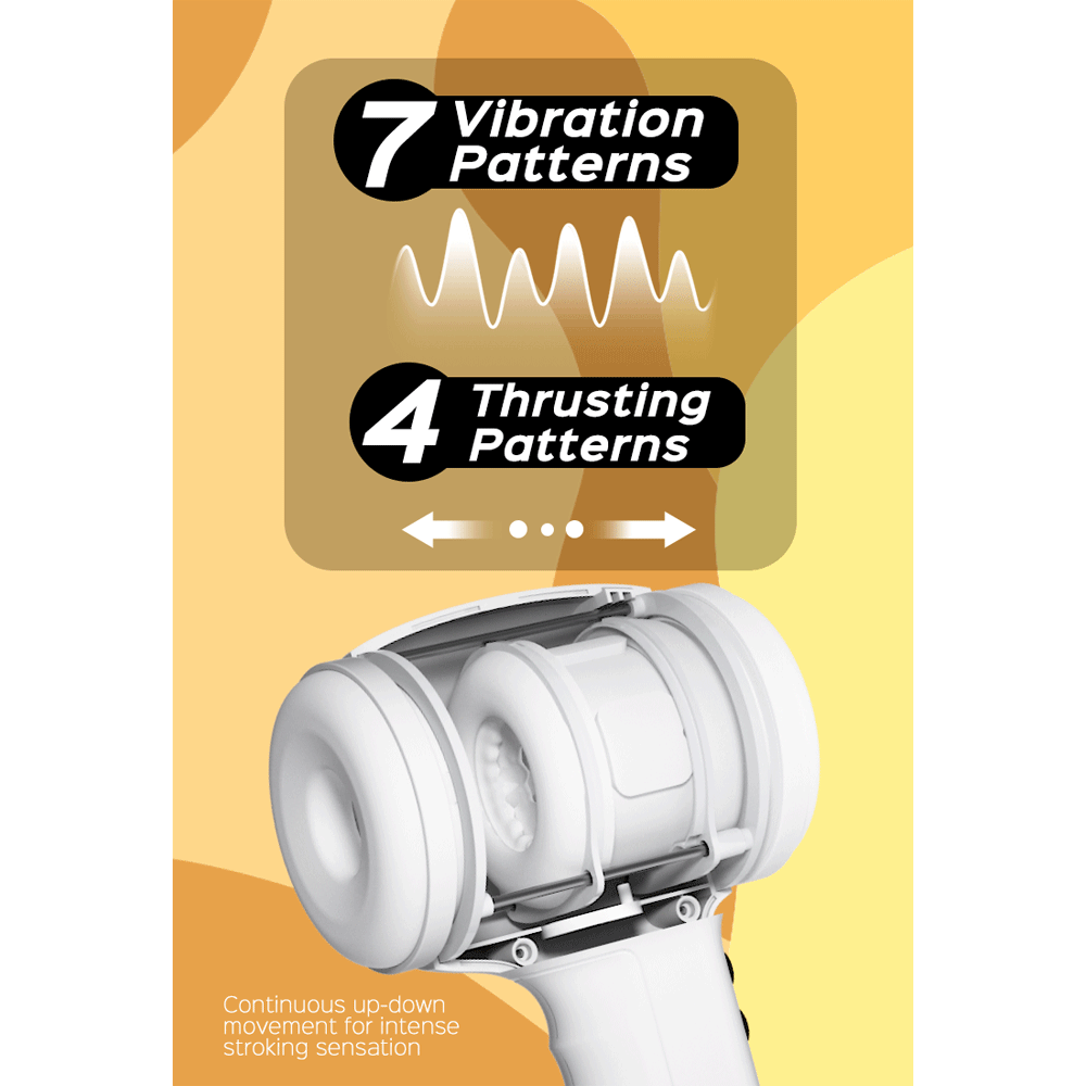 Open-ended and uniquely designed, the automatic masturbator features 7 vibrating and 4 thrusting settings, intensifying stroking and stimulating sensations with up-down lasting movements. The interior's raised texture teases each sensitive point from every angle. Plus, the round orifice holds your shaft firmly and thrusts perfectly back and forth, giving precise coverage to the shaft and triggering pulsing waves. You can interchange the modes to explore your high zones.