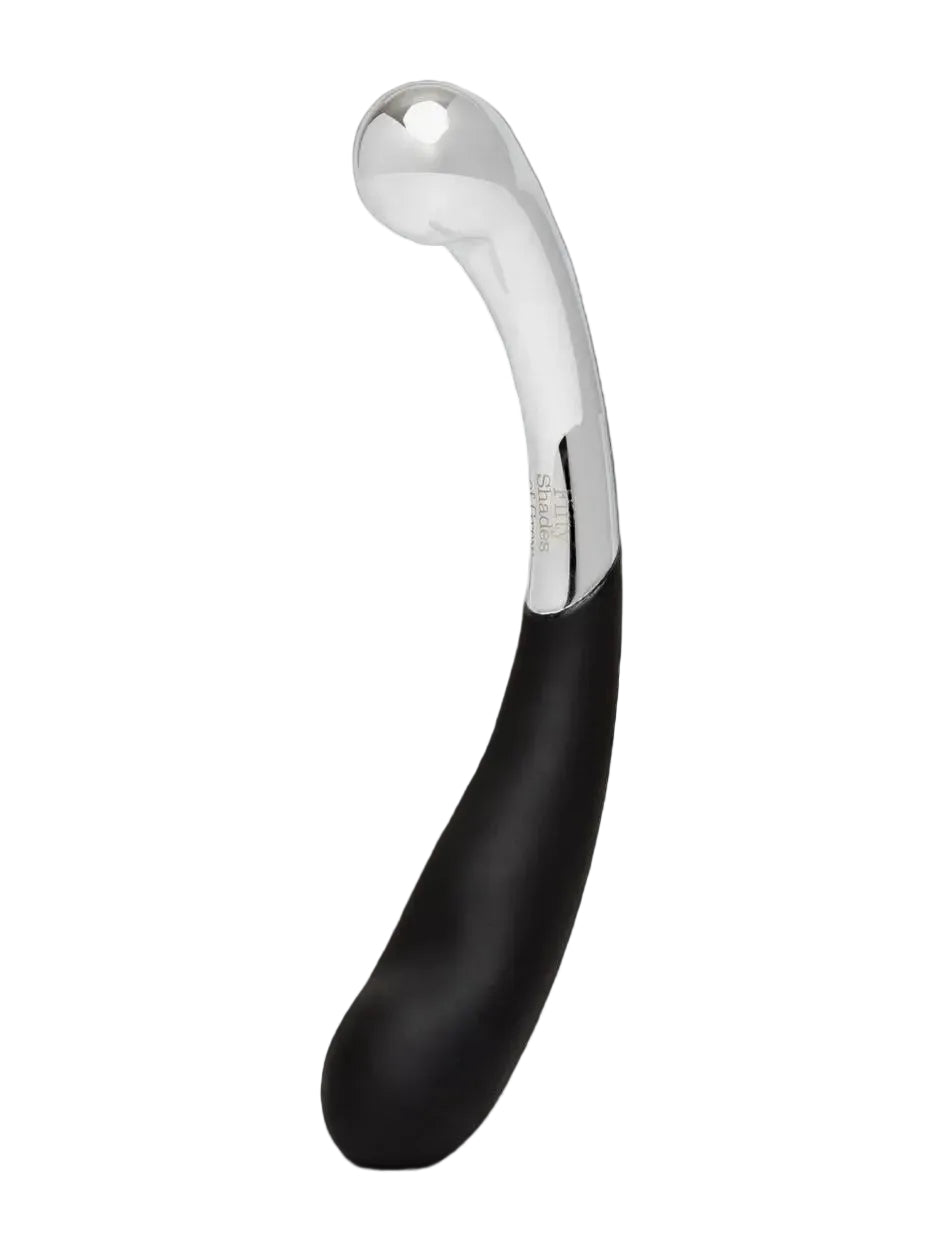 Crafted for those who crave contrast, the Fifty Shades of Grey Sweet Pressure wand delivers a provocative dual-ended experience that shifts from cool, commanding steel to silky, body-caressing silicone. One end features a solid 5-inch metal shaft with a weighted, bulbous head ideal for temperature play and deliciously heavy pressure, while the opposite side offers 5.7 inches of smooth silicone with sculpted contours and a generous 4-inch girth at its fullest curve for targeted G-spot stimulation. The interplay of weight, firmness, and velvety glide creates a self-thrusting rhythm that feels deliberate, deep, and intensely satisfying — refined yet undeniably dirty. Finished with a discreet storage bag and part of the official Pleasure Collection approved by E L James, this wand is built for those who want control, contrast, and undeniable presence.