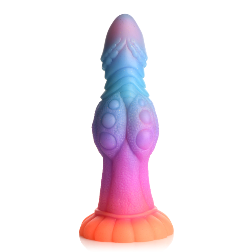 Glittering colors by day, glowing green by night. A cosmic fantasy dildo designed for textured, otherworldly pleasure.