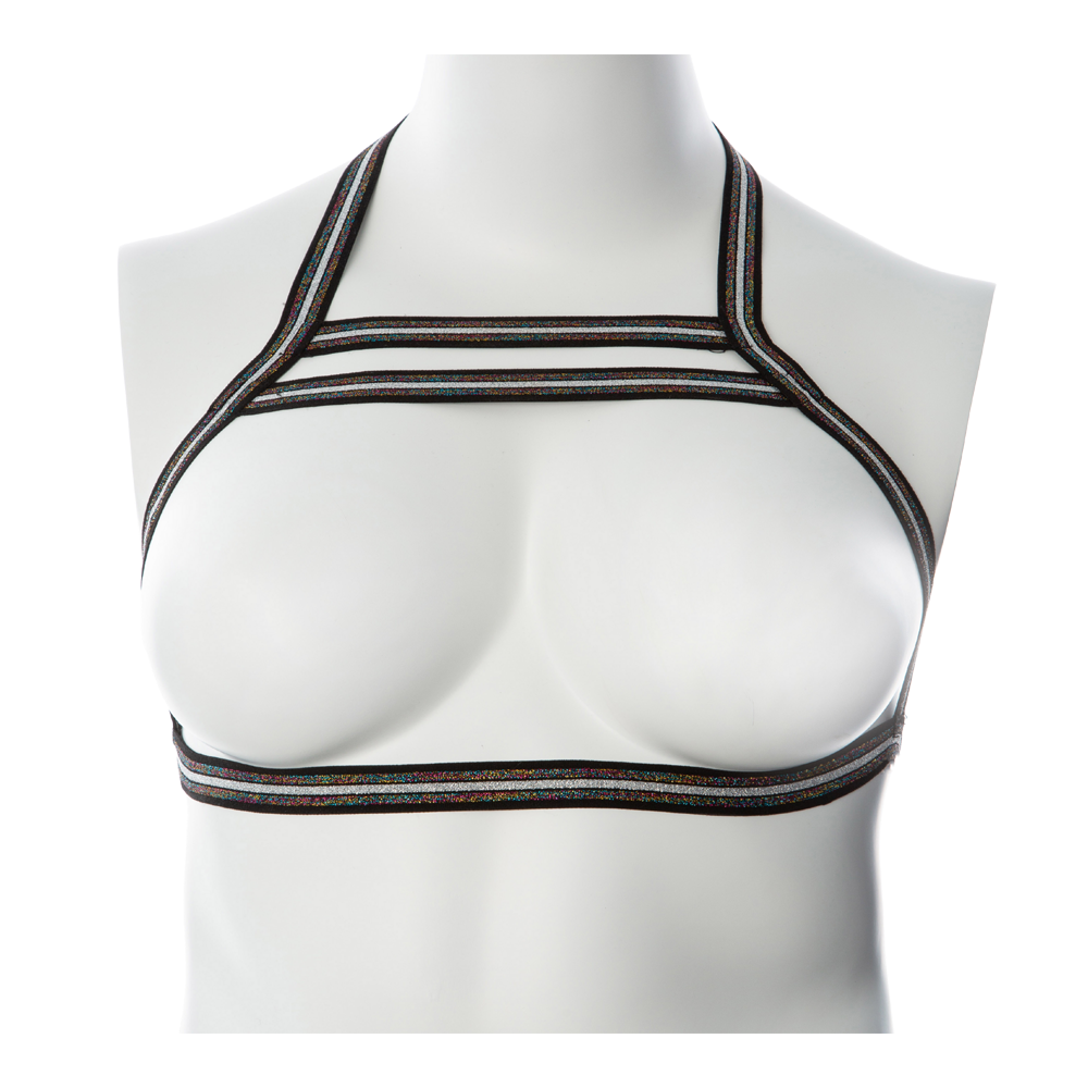 Shine your brightest and show off your shape in our metallic stretch body harness. Be wrapped in our body hugging design, perfect for layering over other garments or wearing as is.