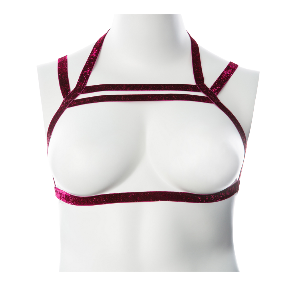 Explore your playful side with our metallic stretch chest harness. Be wrapped in our body hugging design, perfect for layering over other garments or wearing as is.