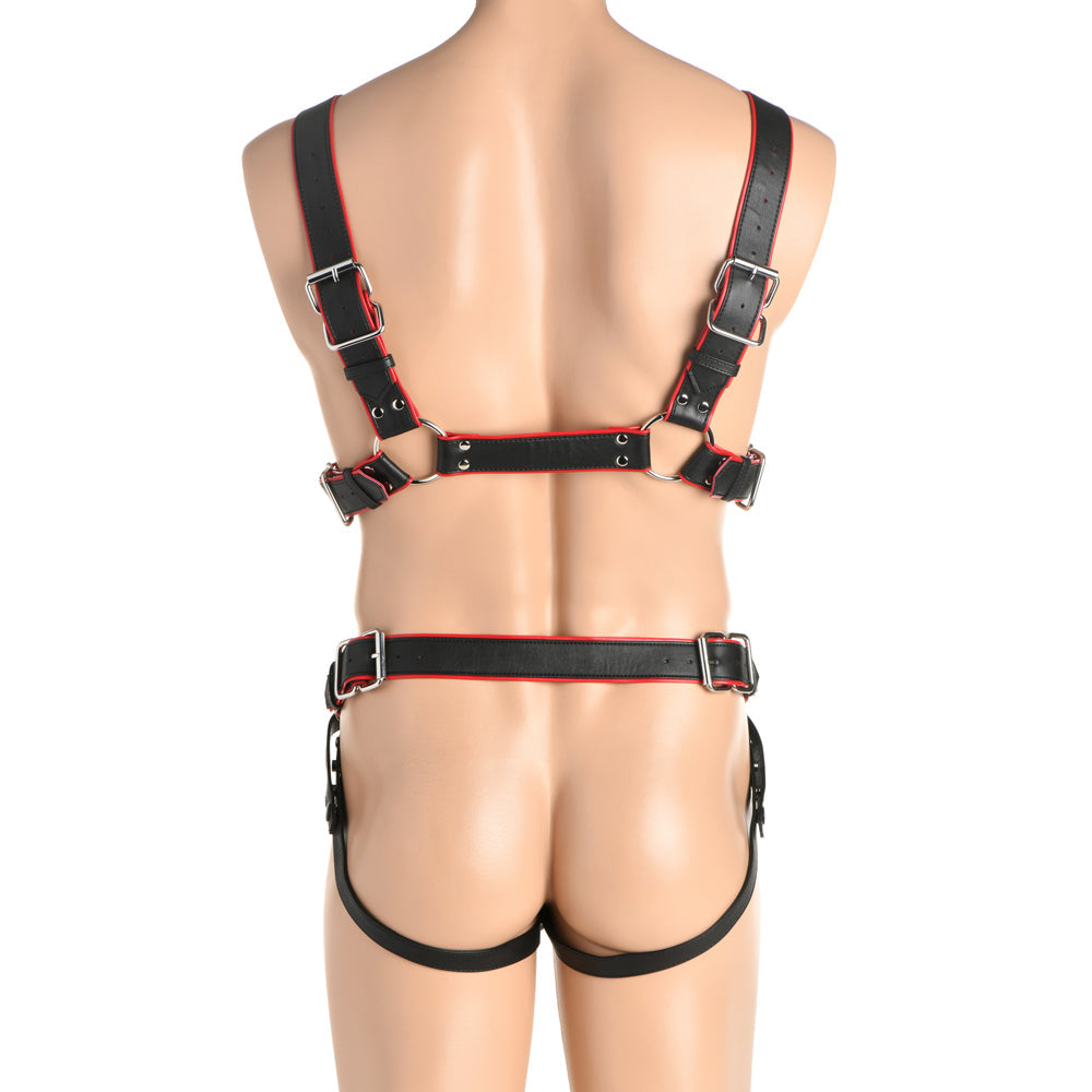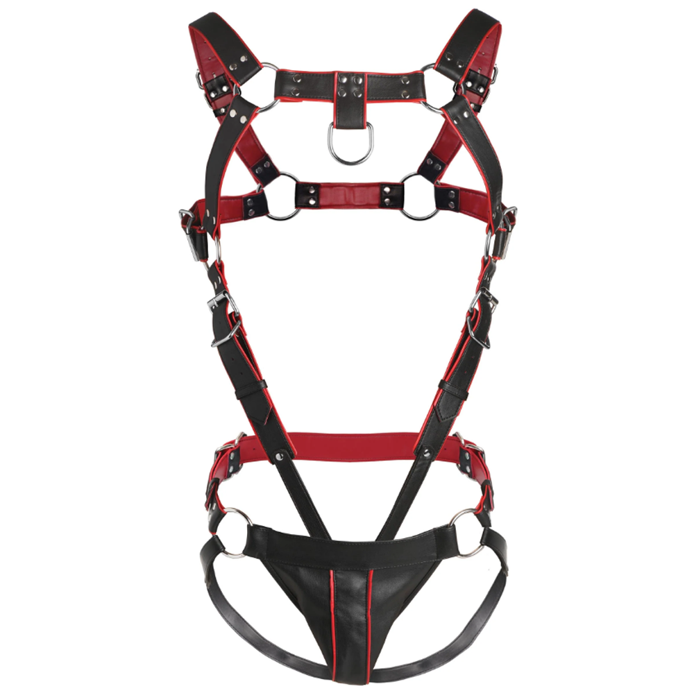 Harness your excitement in more ways than one! With this sexy, black and red, PU leather harness you can show off your body and tether the straps to your rod. Each strap is fully adjustable; use the nickel-free, metal buckles to cinch it tight. At the base of the harness is a 2 inch diameter (50mm) cock ring that serves the dual purpose of enhancing your erections and holding the harness in place. You can choose to expose your goods or cover them with a spacious, matching jock strap. The jock strap covers the front and still exposes your booty with two straps that go around the thighs and a belt that tightens around the waist. Spot clean with toy cleaner as needed and wipe with a soft cloth.