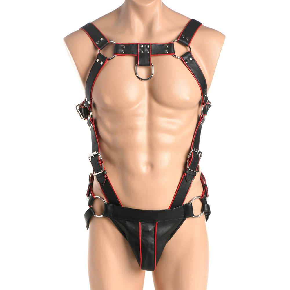 Harness your excitement in more ways than one! With this sexy, black and red, PU leather harness you can show off your body and tether the straps to your rod. Each strap is fully adjustable; use the nickel-free, metal buckles to cinch it tight. At the base of the harness is a 2 inch diameter (50mm) cock ring that serves the dual purpose of enhancing your erections and holding the harness in place. You can choose to expose your goods or cover them with a spacious, matching jock strap. The jock strap covers the front and still exposes your booty with two straps that go around the thighs and a belt that tightens around the waist. Spot clean with toy cleaner as needed and wipe with a soft cloth.