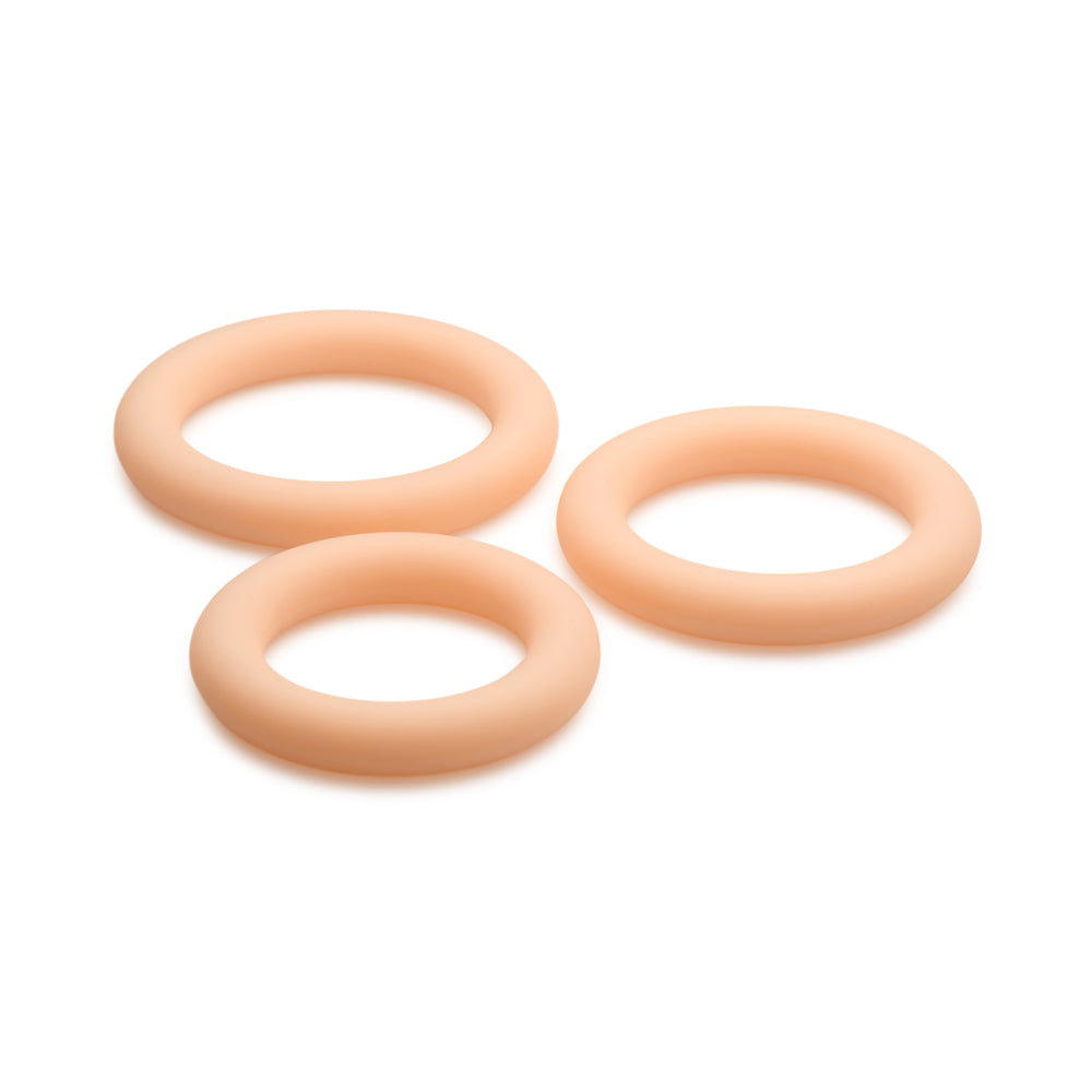 Last longer and stay harder with this silicone cock ring set! These three graduated rings give you a chance to try out three different sizes and find the perfect fit. Choose colors that match your skin tone for a more neutral look and enjoy premium silicone that is phthalate-free, body-safe, latex-free, and best used with water-based lubricants only. Stretch the rings around your shaft, balls, or both. Use them alone or combine them for added pressure and sensation!