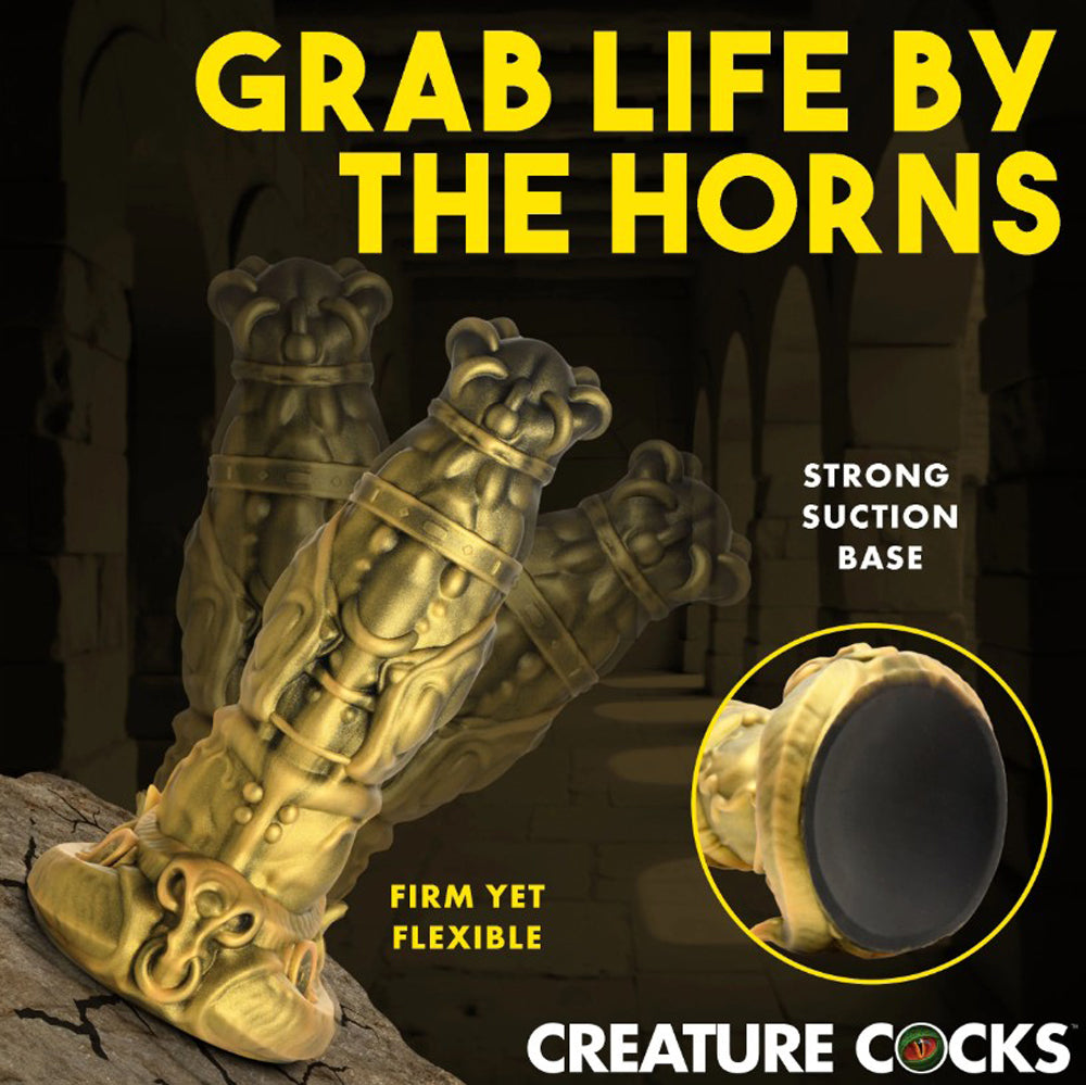 Step into a world of dark fantasy with the Creature Cocks King Minotaur Silicone Dildo. Sculpted with striking golden tones, piercing details, coins, and bull horns, this beastly shaft is adorned with veins, ridges, and bulges that deliver unique stimulation with every thrust.