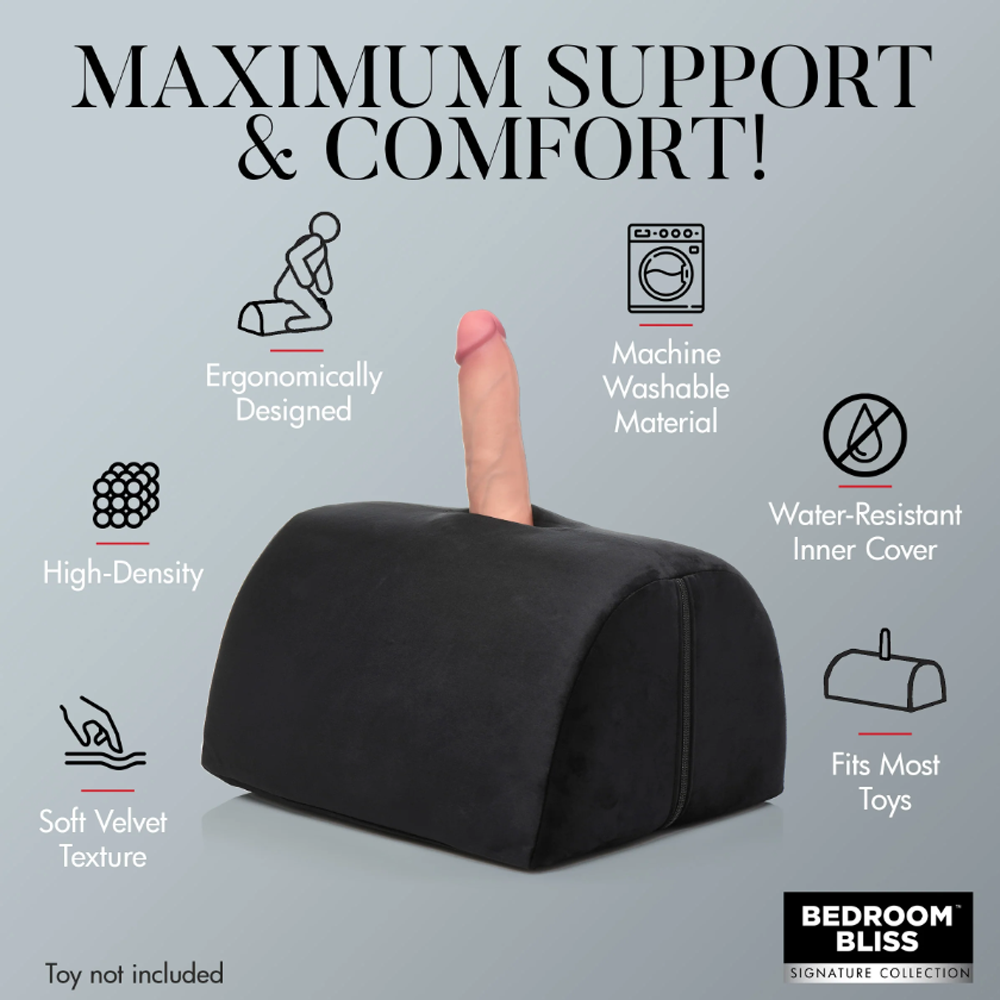Place this high-density foam onto a bed, couch, bench or the floor. Harder surfaces give even more support for the pillow, but softer surfaces give padding to your knees. Grab your favorite toy and slip the base into the pocket. Then turn it on and use some lube as you begin to writhe and grind. Bring your partner in on the action, too! As they slip their hands around your body, they can enter you from behind, your body perfectly poised to receive them as you simultaneously buzz your most sensitive spots! Play around and have fun! Flip over and use the pillow to help them plow you deeper and hit the right angle! Lift up your hips, support your body and explore new positions all with this one formidable, foam pillow!