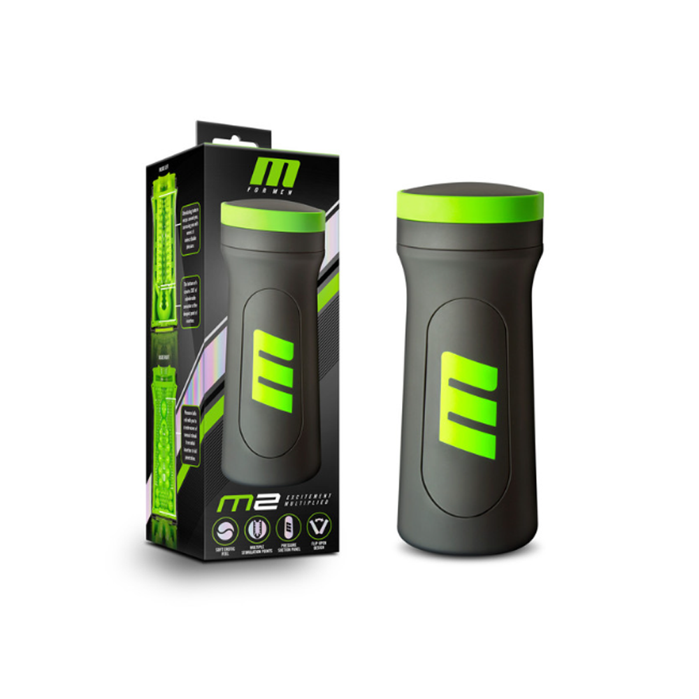 Blush's M For Men M2 Superior Stroker represents the pinnacle of male pleasure devices. This male stroker will give you orgasms with intensities that are almost too much to bear. Let's explore together on how it helps you achieve this. The super soft love chambers are made from our iconic X5 materials. X5 was a revolutionary elastomer we formulated in 2008. It has been the cornerstone of our best selling strokers. Now, lets enter the first chamber. We call it the stroke power chamber. This chamber creates a light suction mimicking pursed lips sucking at your penis. Second, we now enter the pleasure balls and nubs chamber. This chamber has soft little orbs and nubs strategically positioned to envelope, caress, and squeeze at your hard shaft. The nubs undulate in harmony with your penis as you stroke in and out. Now, finally we enter the main orb chamber. As your penis head enters it is softly rubbed and squeezed. You will especially feel this as your orgasm when your head is at it's most sensitive. While all of this is happening you can utilize the squeeze panel. You are in full control where on your penis you want to squeeze and how much you want to squeeze. Imagine, all of these incredible and unique sensations are all happening to your penis everywhere, all at one. Your orgasm will be so intense you will find you might want to back off lest you pass out from pleasure. The flip open design is a marvel in engineering. It's design will accommodate thicker penises. And makes cleanup quick and simple. The smooth canister fits perfectly in the palm of your hand and has a good weight on it. To use, twist off green ring, then twist off black cap. You can opt to twist back on the green ring for a snugger fit and increased suction or keep it off if you are thicker than average. Apply your favorite water based, silicone or hybrid lubricant. Never use with petroleum or oil based lubes, greases etc as it will break down the material. When done, twist off the green ring, flip open the canister and rinse clean with soap and water. Pat dry with a clean cloth or paper towel. Air dry then twist cap and ring back on.