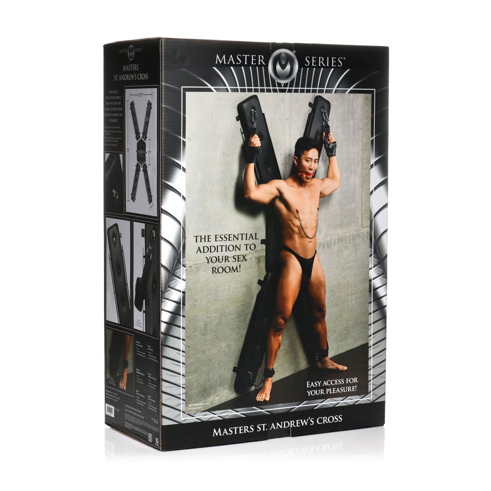 After mounting the cross securely to the wall of your choice, grab your favorite toys and kinky implements and place them nearby. After warming up your submissive, attach their wrists and ankles to the cross to keep them in place. You can have them facing forward or facing the wall. Once in place, feel free to use nipple clamps, floggers, whips, rope, gags and more! Your scene has just been amplified by a real St. Andrew's Cross in your sexy space! As you use the whips and floggers on them, you notice how much easier it is with a cross that doesn't take up much space! It allows you to have more room to use the impact tools and move around. When you're done with your scene, untie ropes or uncuff your submissive and bring them onto the bed, chair, couch or floor and give them some aftercare.