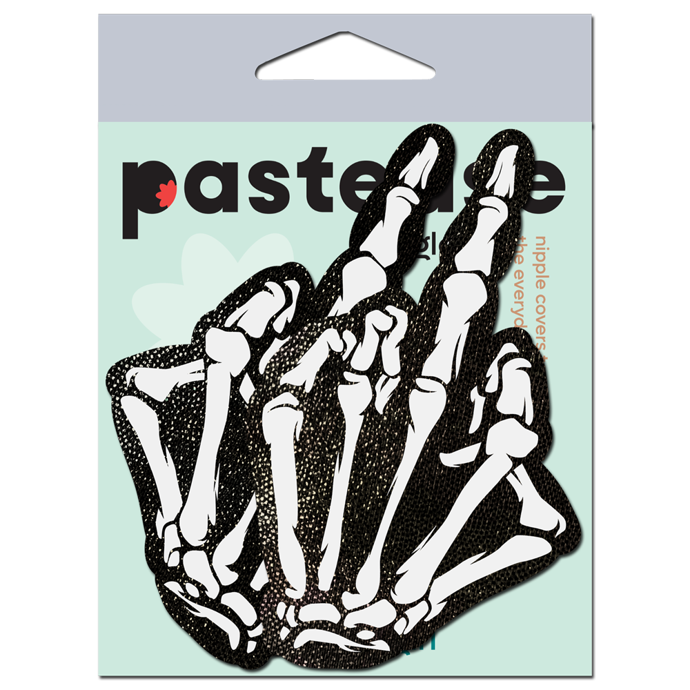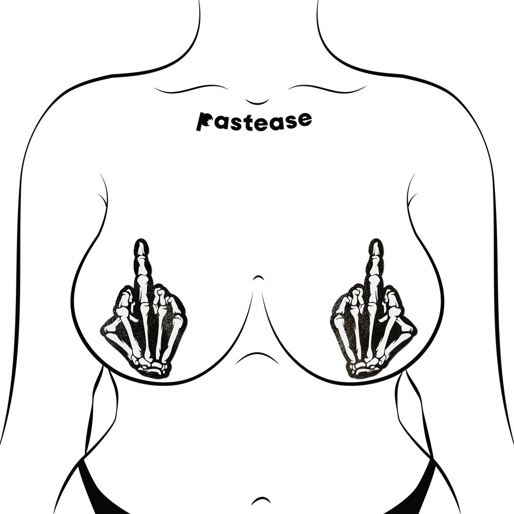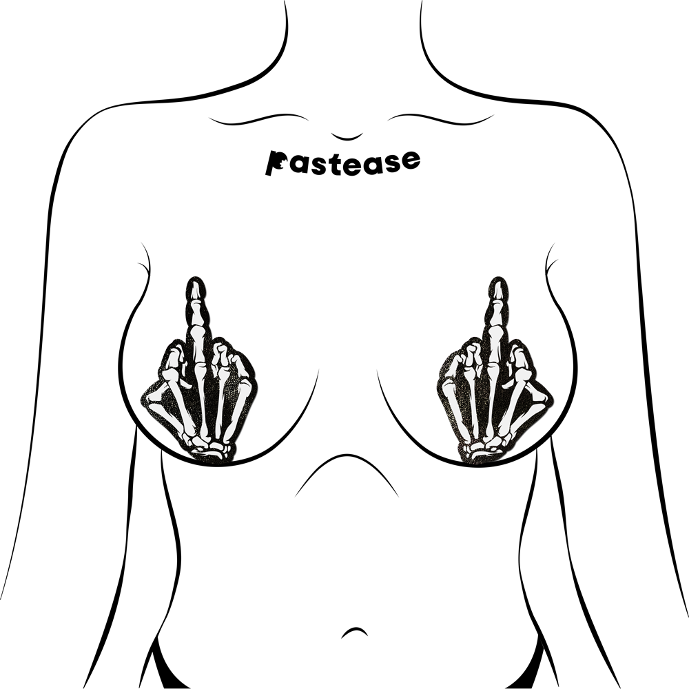 Introducing our Middle Finger Skeleton Hand Pasties Glow in the Dark White & Black Boney Hand Nipple Covers by Pastease® – the ultimate accessory for Halloween and festival enthusiasts!