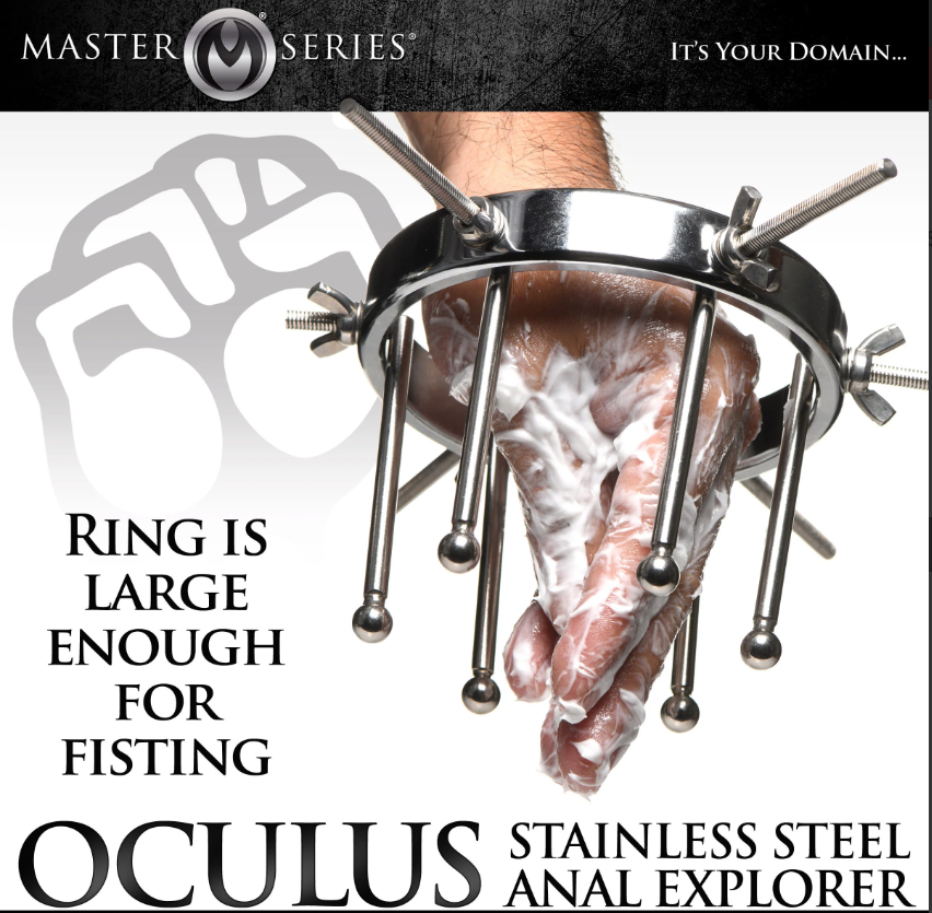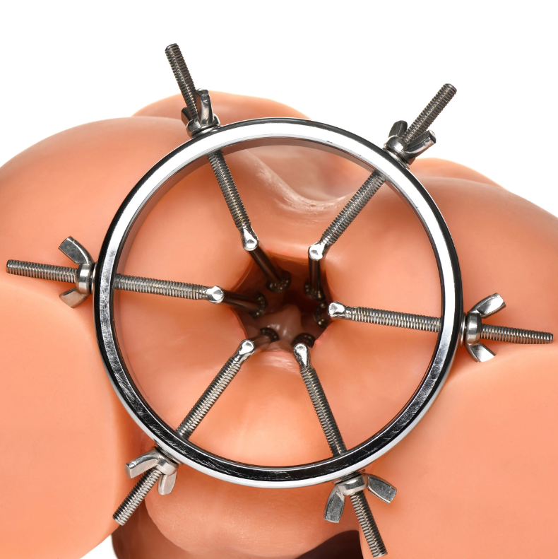 The Anal Explorer consists of one large ring with a diameter of 4.1 inches and 6 dilators that have smooth rods with small, round, balls on the ends of them. Insert it almost 3 inches deep and spread their hole wide open! The ring is wide enough for you to fit your fist through, as well! Each dilator rod can be adjusted individually using the wingnuts to tighten or loosen the position on the screw.