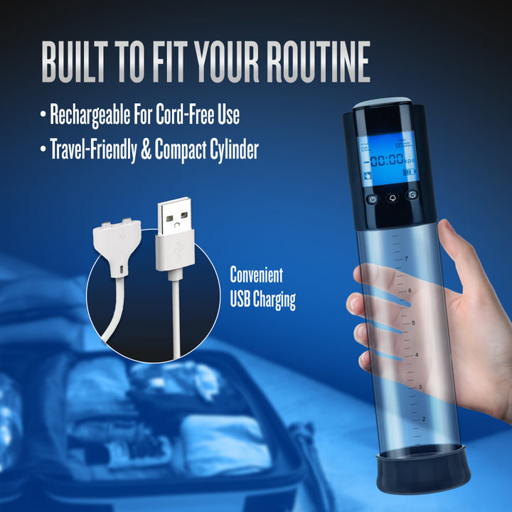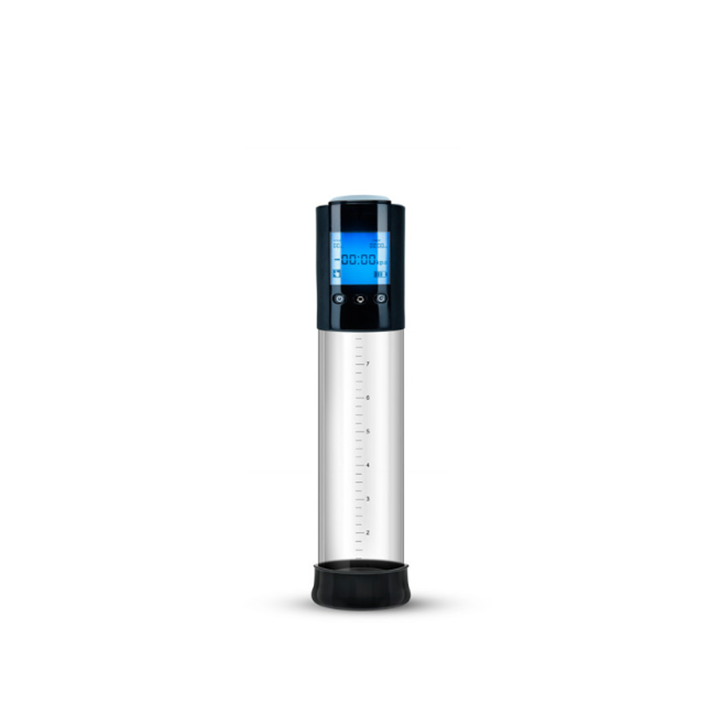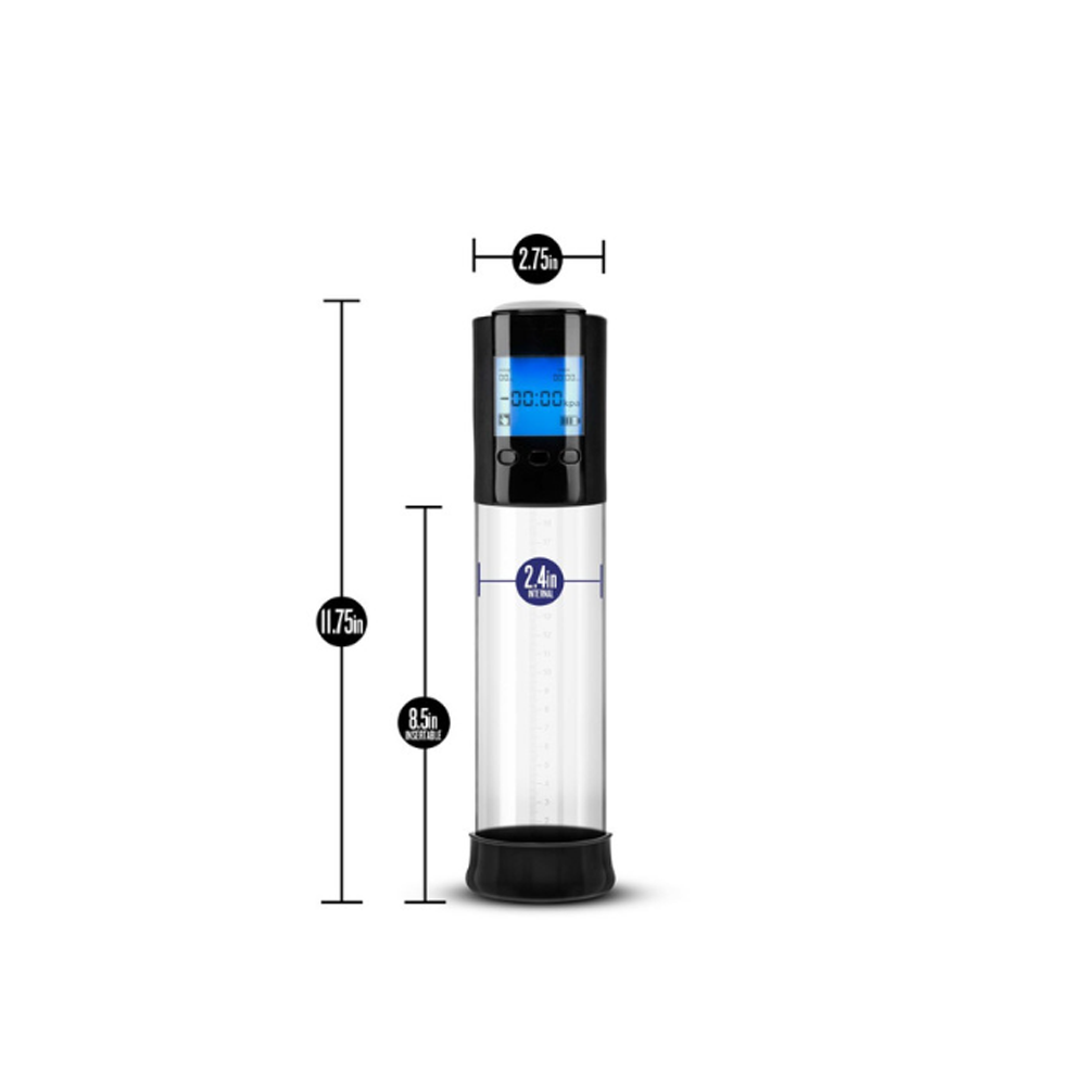 Up your game and heighten your sensations with the automatic Performance Smart Pump. Smart pump allows you to set and save your favorite settings. Measure your experience with a digital screen displaying time and kPa units of pressure. Your Smart Pump also features a crystal-clear cylinder with an etched measurement markers, allowing you to easily see your gains as they happen. Fully automatic, push button controls allow for one-handed play. Featuring airtight cylinder measures 8.75"L x 2.75"W, automatic smart pumping, pressure release button, rechargeable. Instruction manual and Stay Hard Donut cock ring included.