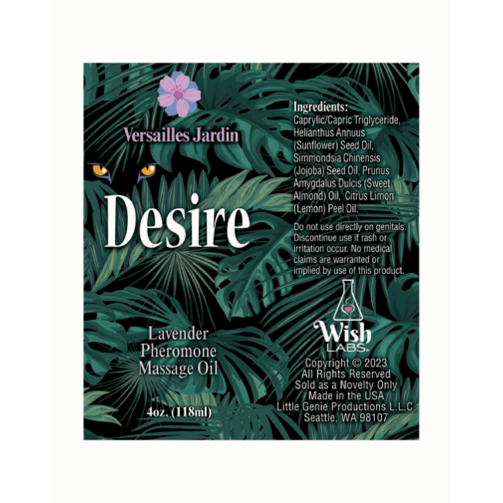 Awaken the primal desire and unleash your wildest fantasies with Desire enchanting pheromone-enhanced massage oil by Wish Laboratories and Little Genie.