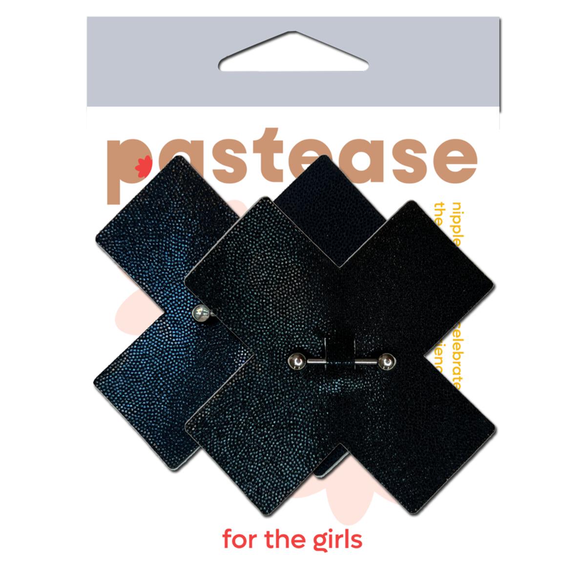 Crafted on a form-fitting material, these Liquid Black Cross X Pierced Barbell Pasties make a fearless statement. The attached stainless steel barbell piercing mirrors the edgy allure of a traditional nipple piercing but without the discomfort. It's time to step into a realm of self-expression where pain takes a backseat.