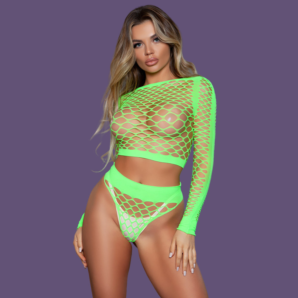 Light up the night in this neon green fishnet bodystocking. Bold, electric, and made to flaunt your confidence.