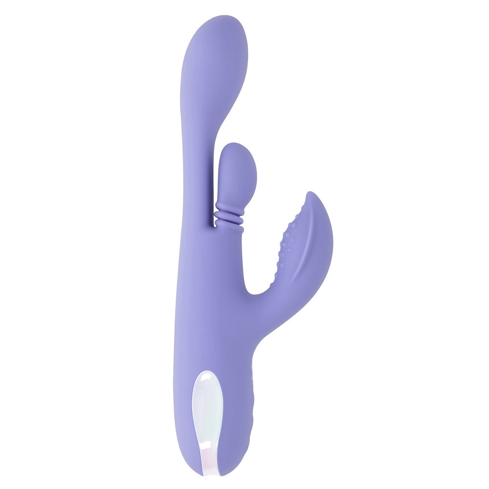 Triple-action design combines deep shaft vibration, clitoral stimulation, and a swirling thrusting nub