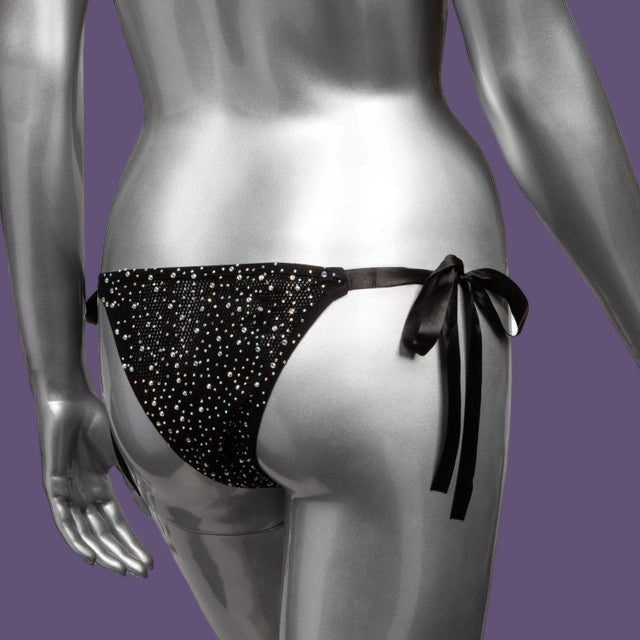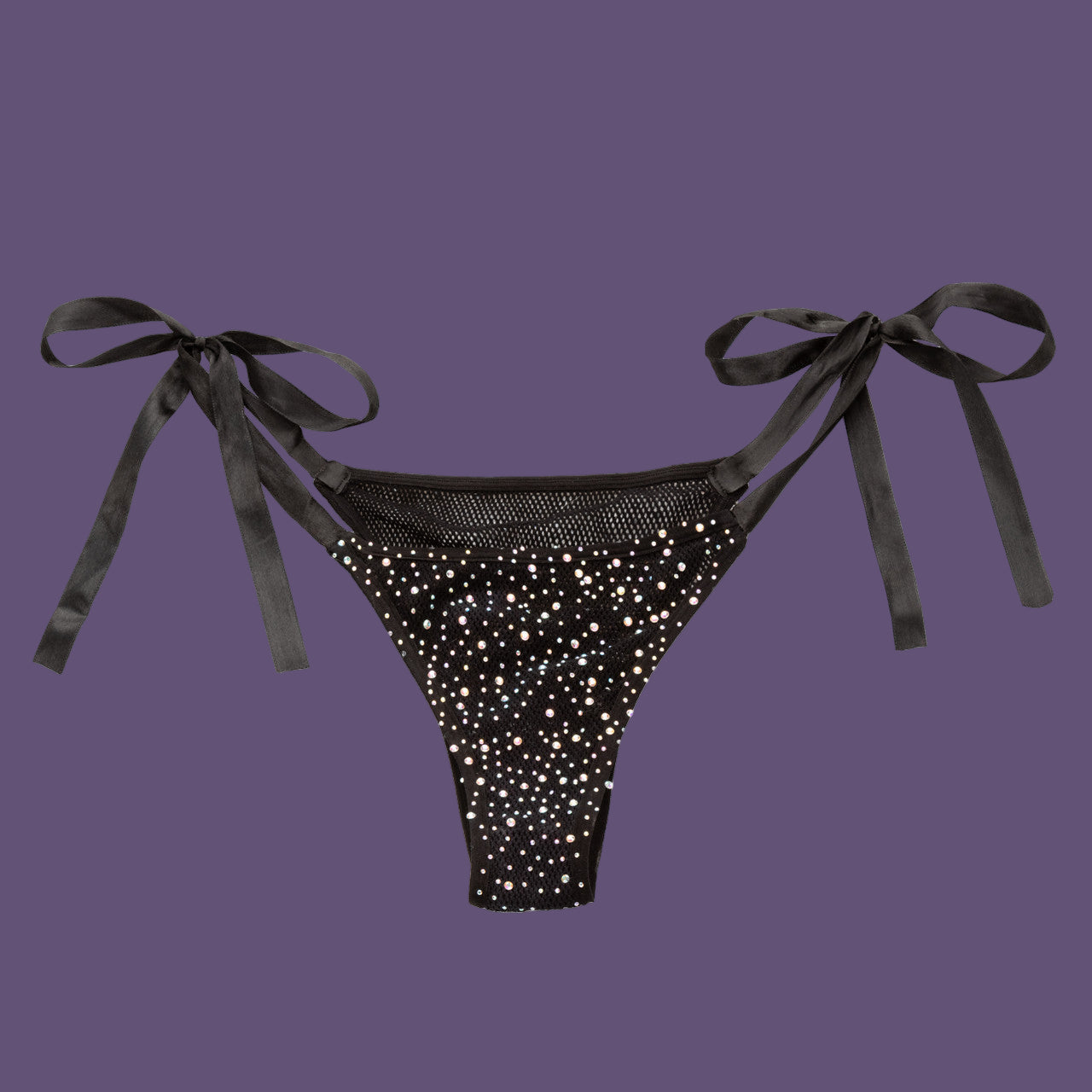 Shimmer, tease, and tempt in sparkling rhinestone mesh. Satin side ties unwrap a world of playful, sultry allure.