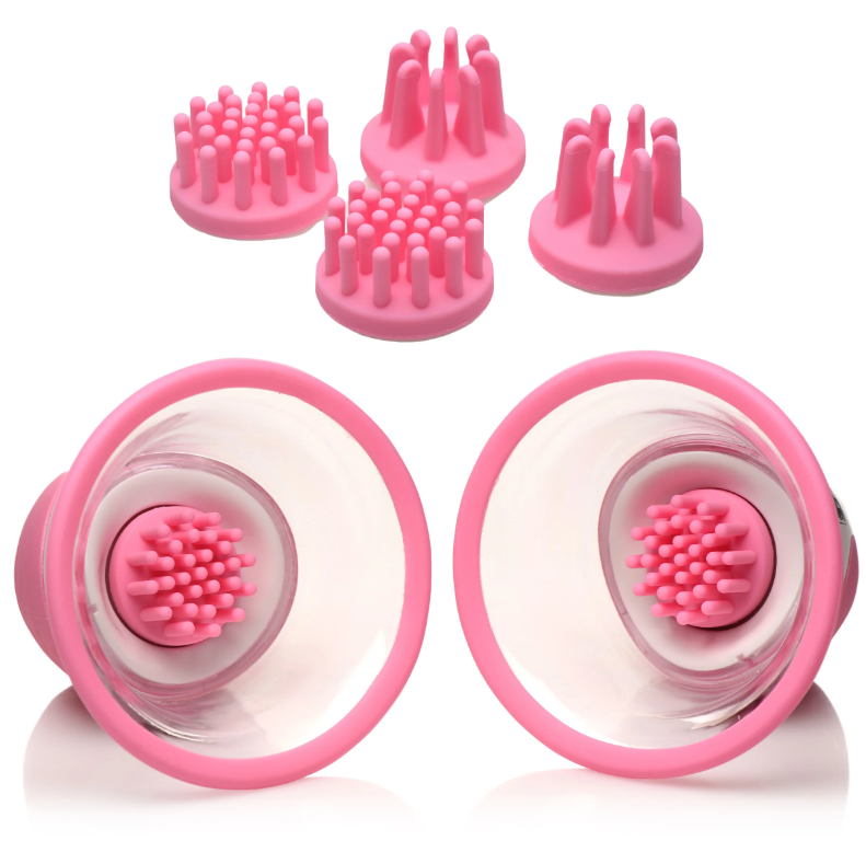 For those who want to expand the potential for arousal from nipple stimulation, or for those who love constant attention on their nipples and areolas, these rotating silicone nipple suckers are for you! Each of the cups holds on via suction so they are hands-free!