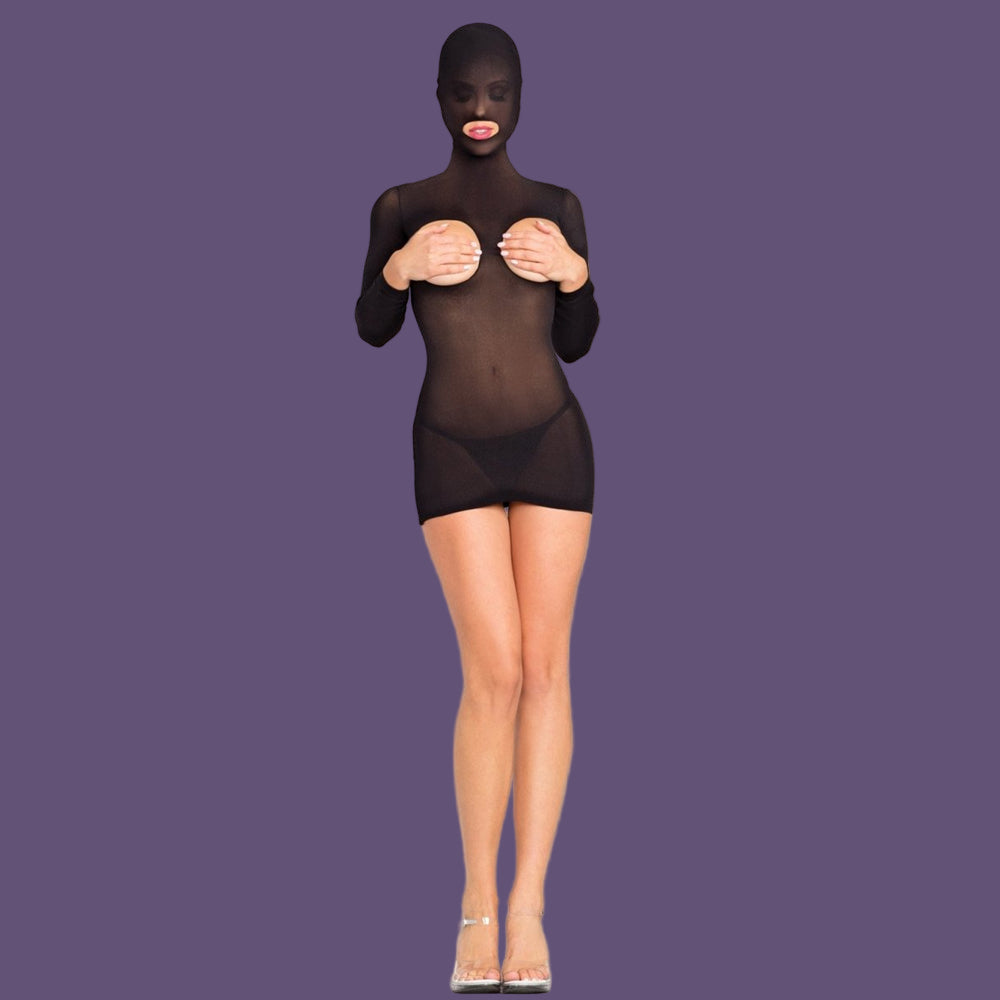 The Be Wicked Rough Romance Bodystocking Dress in Black brings together confidence, mystery, and sensuality in one unforgettable piece. Crafted from sheer, stretchy nylon, this mini-length bodystocking features an attached hood and long sleeves for a striking silhouette that’s both provocative and fashion-forward. Designed with open cups and crotch for a daring edge, it perfectly contours your curves while leaving just enough to the imagination. Whether for an electrifying night in or a bold statement look, Rough Romance is made for those who thrive on intrigue and confidence.