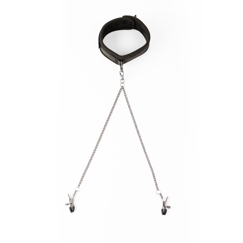 Indulge in the perfect blend of elegance and excitement with the Sei Mio Twin Tweaks Collar and Nipple Clamps set. This beautifully crafted collar, made from velvet-soft faux leather, rests comfortably around the neck while setting the stage for playful restraint.