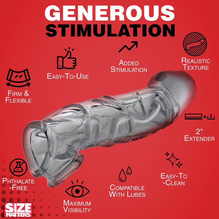 This extender sleeve gives you two whole inches of solid penis to plow into your partner! The realistic texture, featuring a bulbous head and bulging veins, along with a subtle curved shape will deliver a new kind of internal massage. Just lube up and put your entire package through the first hole, allowing your scrotum to go through the bottom hole for a satisfying stretch. The solid 2-inch tip is followed by a hollow interior that allows for a snug and secure fit. This body-safe and phthalate-free material is compatible with silicone and water-based lubricants. Use warm water and mild soap or a toy cleaner to clean after use.