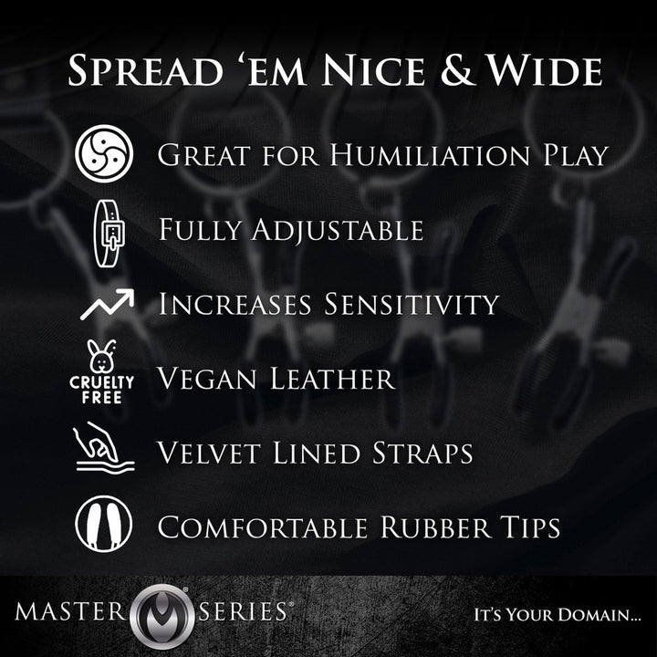 Spread your lover nice and wide in comfort! The straps are velvet lined and easy on the skin, while the rubber tips on each clamp prevents discomfort as they press on the sensitive areas of your partner.