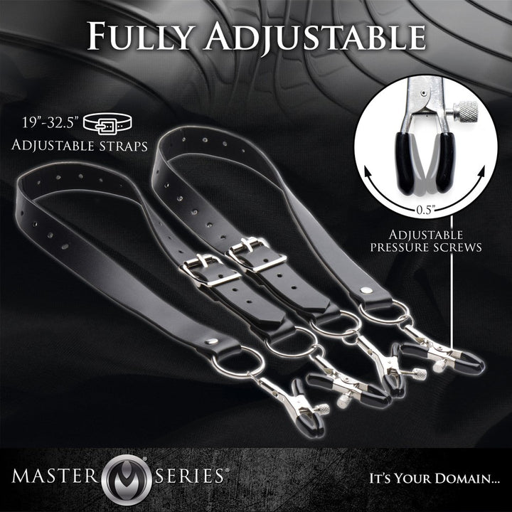 Adjustable pressure clamps and straps, fully adjustable Spread em wide! This Extra Large Labia Spreader is designed to open your lovers vagina and put their sensitive parts on display for your enjoyment. The adjustment screws found on each clamp let you control the clamping pressure with ease, while the straps themselves can be customized to fit most leg and waist sizes.