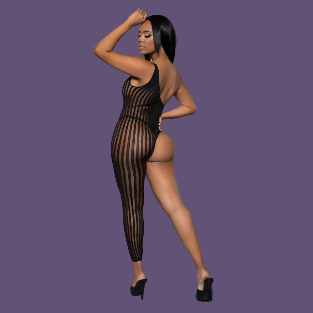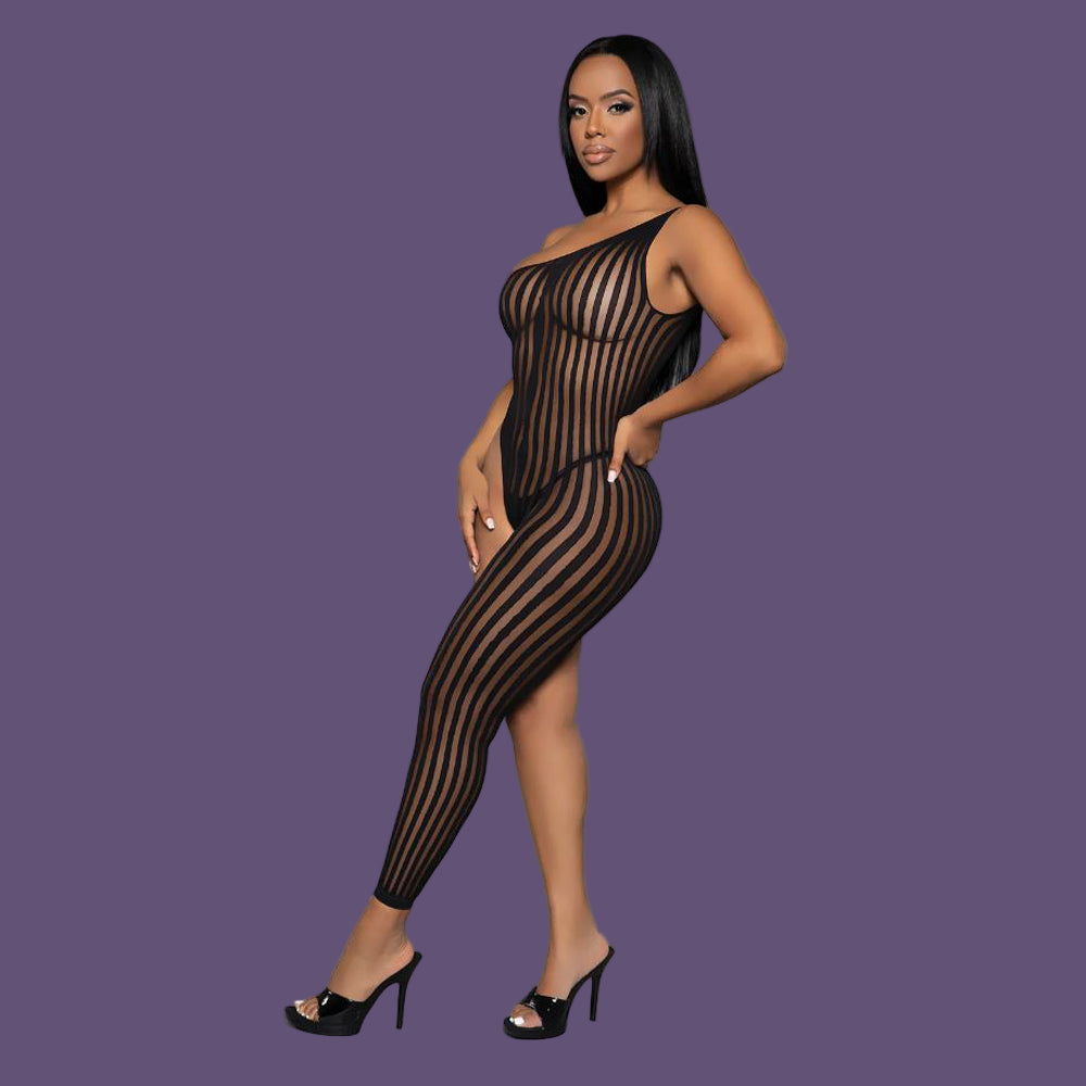 The Be Wicked Stealing Hearts Bodystocking in Black is designed to command attention with every move. Crafted from soft, sheer nylon, it features a dramatic one-shoulder neckline and a daring single-leg silhouette that creates instant visual intrigue. The vertical stripe pattern elongates the body while hugging your curves in all the right places. Bold, modern, and effortlessly seductive — this piece redefines sultry sophistication.