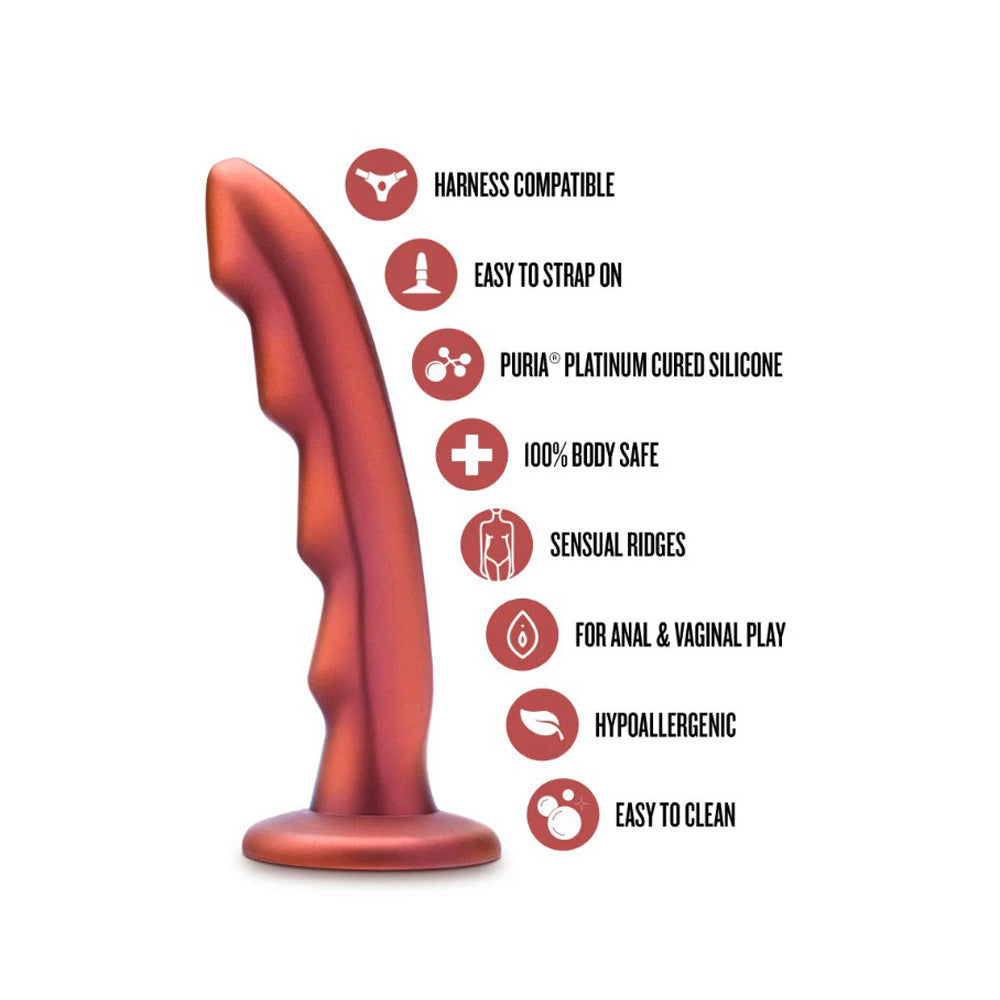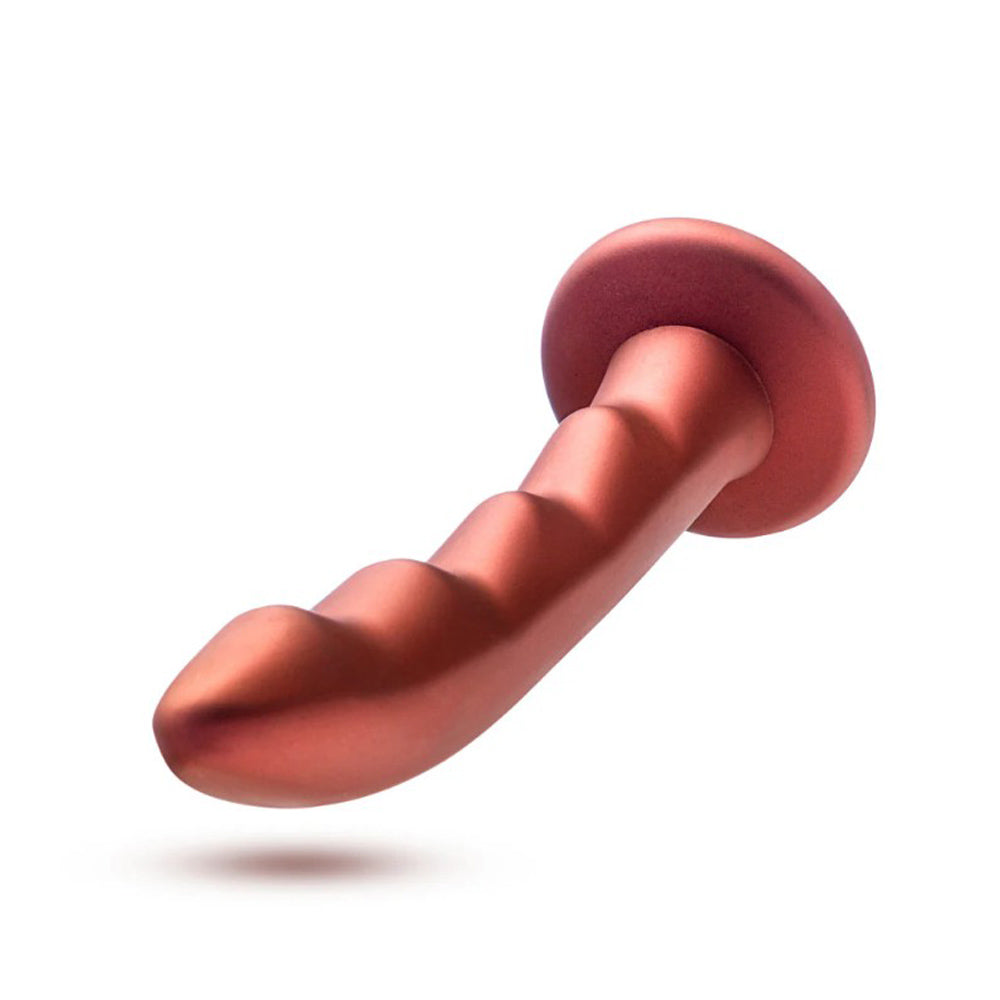 A ridged silicone pegging dildo with curve and harness-ready base.