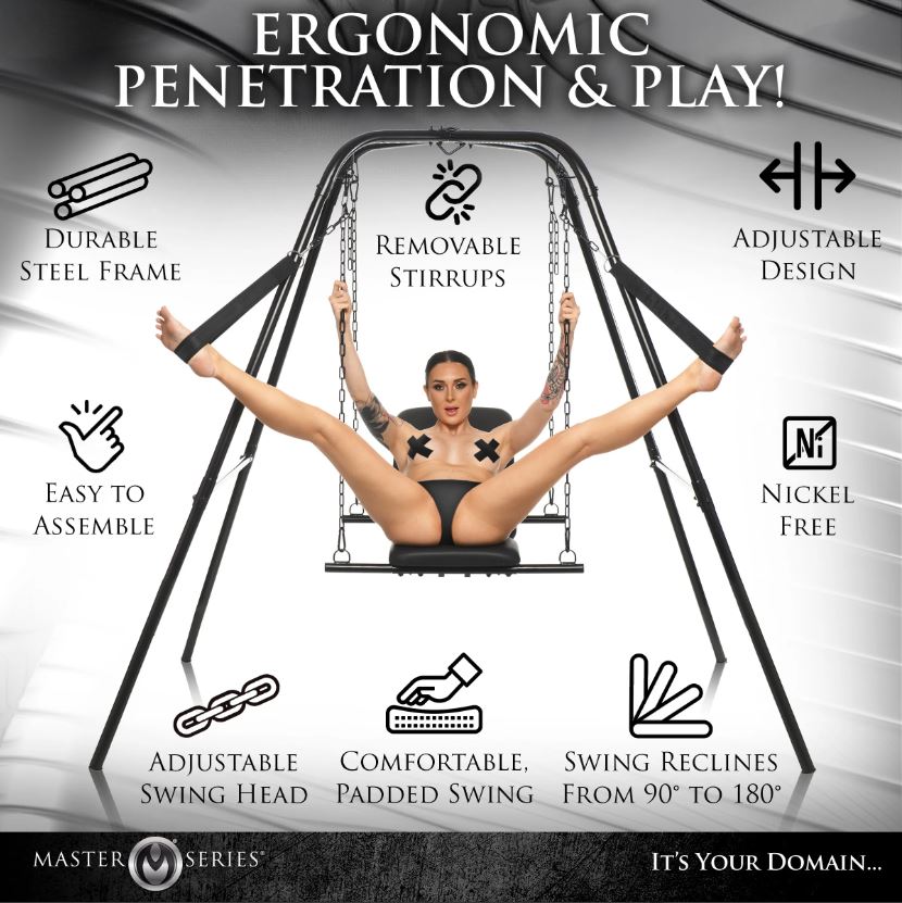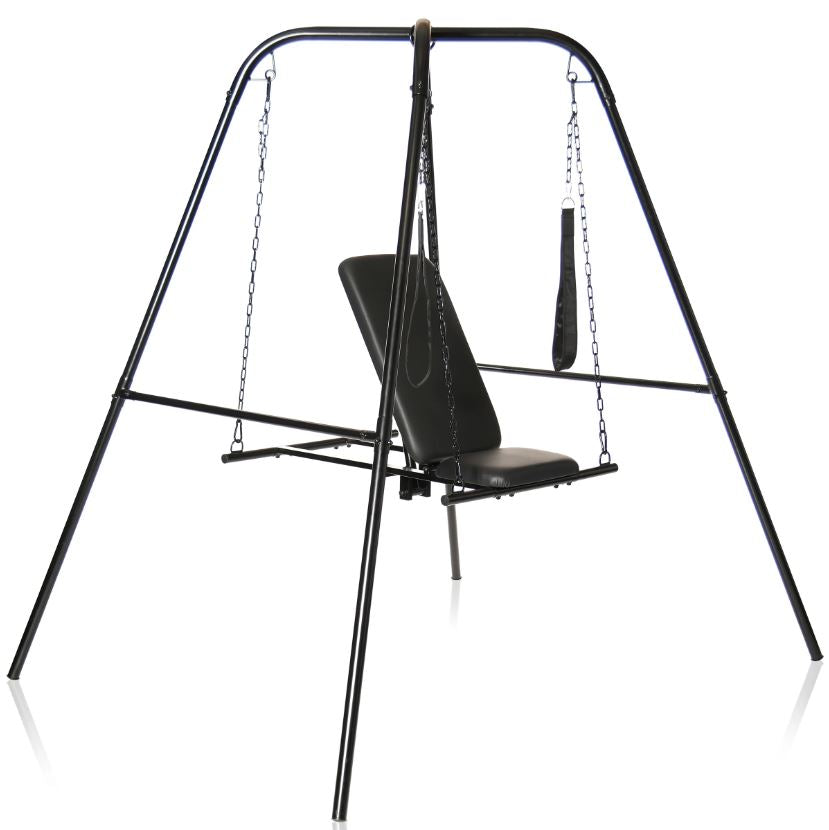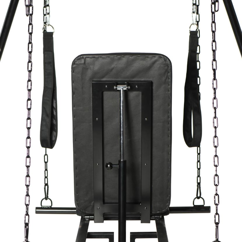 You and your playmate deserve something that takes your sex life to the next level! With this adjustable swing stand, you get more support than with a sling or traditional sex swing and can enjoy increased comfort and support! Sit upright or lay back and recline to any degree. You can go from 90 degrees sitting up to 180 degrees laying completely parallel to the floor, flat on your back. Keep your legs lifted with the stirrups and hang on with your hands using any of the 4 suspension chains. The durable design can handle up to 330 lbs so you can climb on top and feel safe and secure. To ensure playtime is ergonomic, the height is also adjustable. The plush pads are covered in black, PU leather and are vegan friendly. Frame is made out of iron.