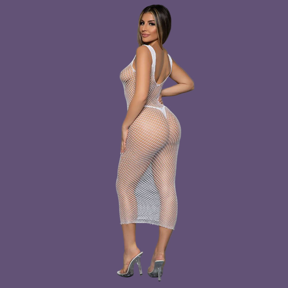 Turn every move into temptation in sheer white fishnet perfection. This bold maxi dress is made to captivate completely.